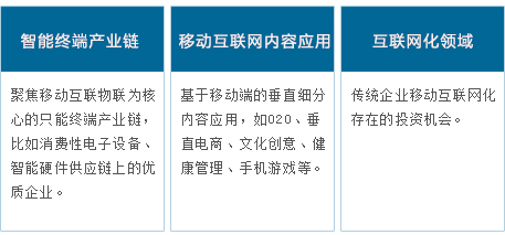 云創(chuàng)資本的投資領域主要集中在移動互聯(lián)產(chǎn)業(yè)(智能終端產(chǎn)業(yè)鏈、移動互聯(lián)內(nèi)容及應用、傳統(tǒng)企業(yè)互聯(lián)網(wǎng)化領域),投資目標是成長型、創(chuàng)新型優(yōu)質(zhì)企業(yè)。