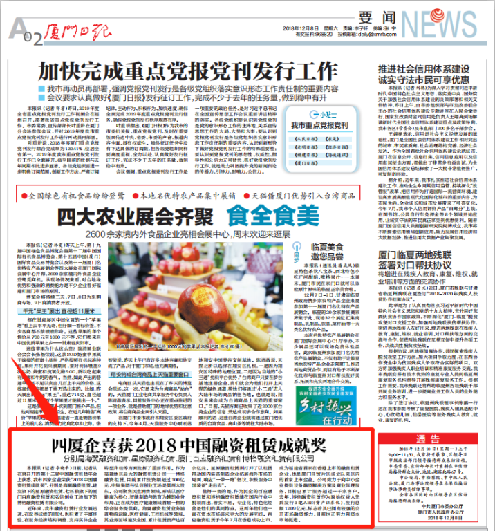 廈門日報(bào) l 四廈企喜獲2018中國融資租賃成就獎